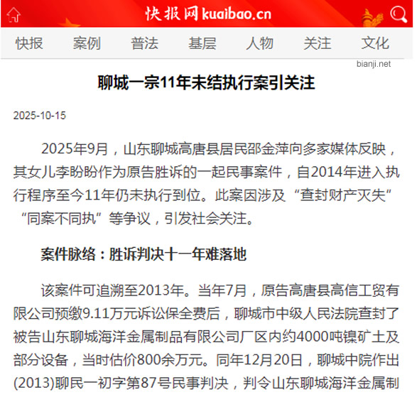 2025年9月,山东聊城高唐县居民邵金萍向多家媒体反映,其女儿李盼盼作为原告胜诉的一起民事案件,自2014年进入执行程序至今11年仍未执行到位。此案因涉及“查封财产灭失”“同案不同执”等争议,引发社会关注。