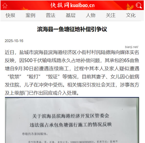 近日,盐城市滨海县滨海港经济区小街村村民陆德海向媒体实名反映,因500千伏输电线路永久占地补偿问题,其承包的65亩鱼塘自9月30日起遭遇连续施工,过程中其本人及家人疑似遭遇“软禁”“殴打”“毁证”等情况,目前其妻子、女儿因心脏病发住院,儿子在冲突中受伤。相关情况引发社会关注,涉事各方及上级部门已作出回应或介入处理。
